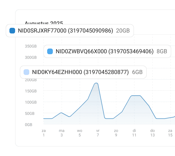 Met onze uitgebreide analytics heeft u altijd inzicht in uw verbruik. U kunt eenvoudig filteren op databundel of individuele SIM-kaarten en het verbruik over tijd zien.